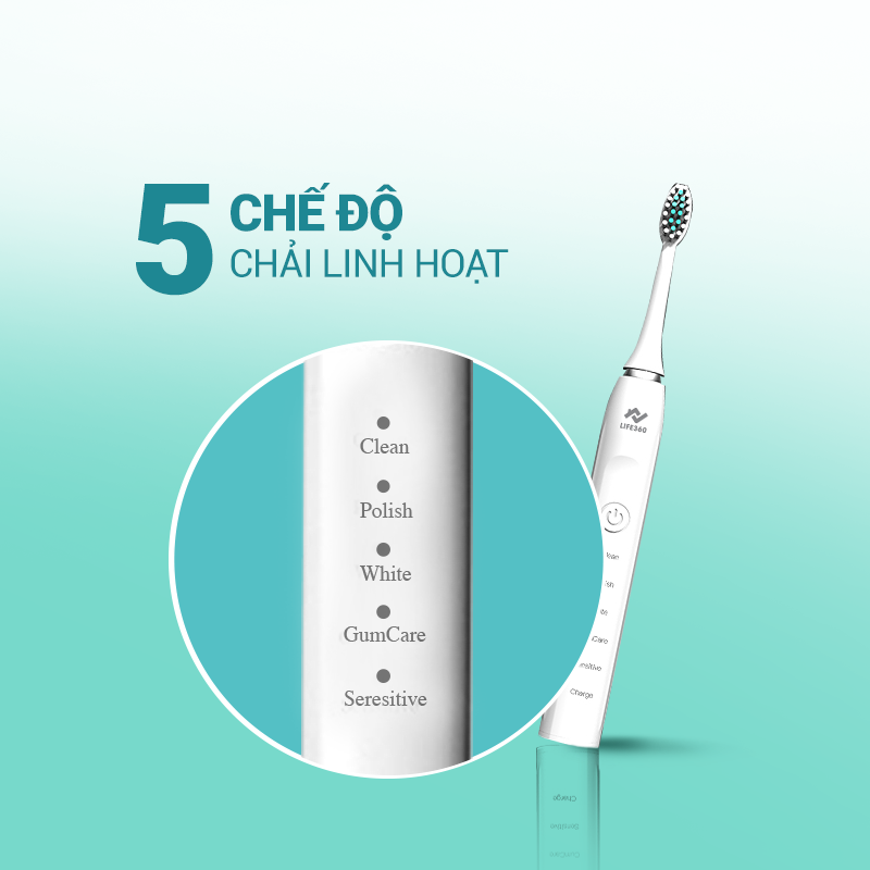 • 5 chế độ chải răng linh hoạt: Làm Sạch, Đánh Bóng, Làm Trắng, Massage Nướu, Cho Răng Nhạy Cảm