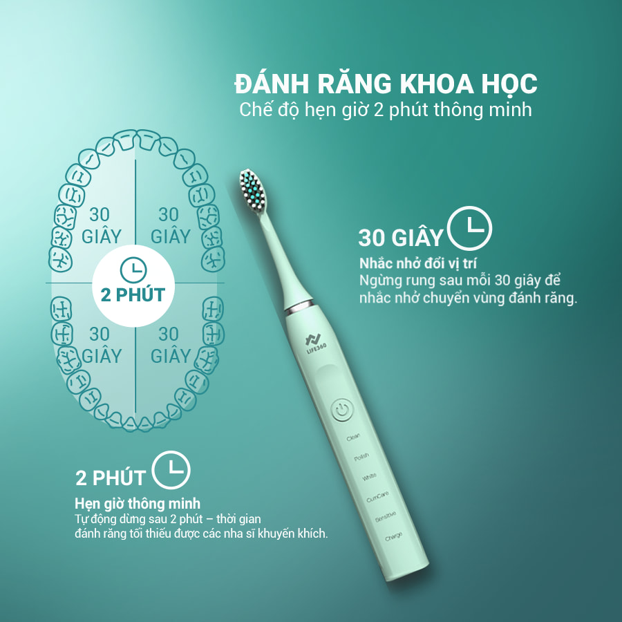 • Cứ sau 30s máy sẽ tự ngắt khoảng 0.5 – 1s để nhắc chuyển vùng đánh răng. Sau 2 phút, máy sẽ tự động tắt.