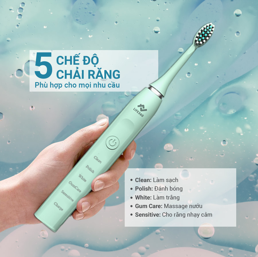 Sử dụng bàn chải điện sonic Life360 LE-BCD22B để giúp làm sạch hiệu quả, loại bỏ mảng bám cứng đầu, vi khuẩn tích tụ trên răng lâu ngày gây mùi hôi thối, khó chịu. Ngoài ra, sử dụng bàn chải điện về lâu dài sẽ tránh tình trạng bị mòn răng do không biết cách điều chỉnh lực chải.
