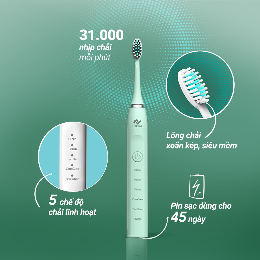 • Chuyển động của bàn chải đánh răng điện thông minh sonic Life360 nhẹ nhàng hơn so với chuyển động thủ công, từ đó giúp cho việc đánh răng thoải mái hơn, tiết kiệm công sức trong mỗi lần đánh răng.